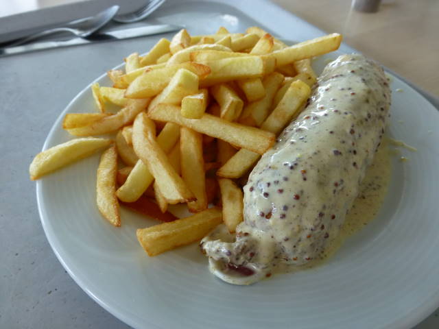 左がマスタードソースたっぷりのソーセージとフレンチフライ。