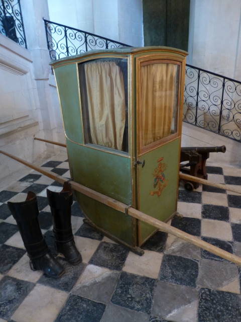 階段下には、18世紀の乗り籠が。横に置かれているのは2kgもある、馬車御者用の長靴。