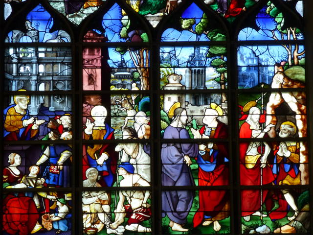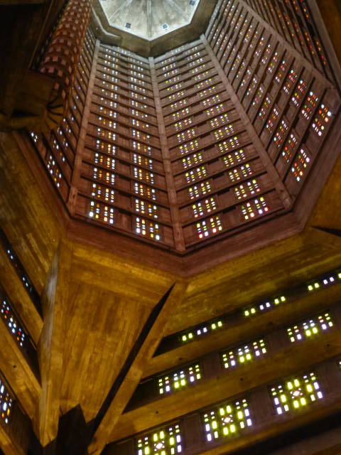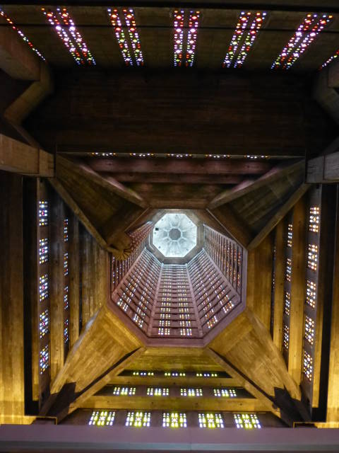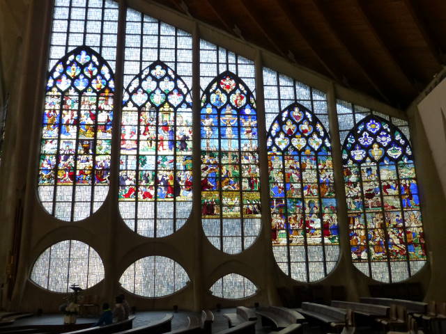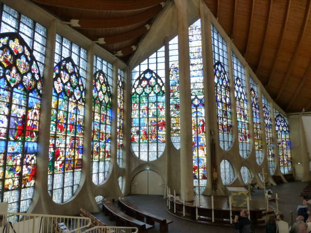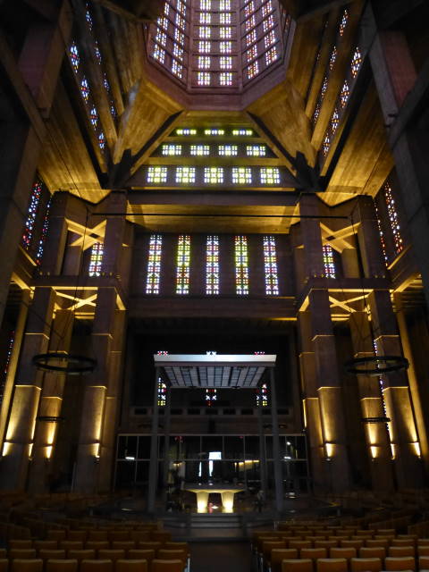 引き潮をイメージした外観と、船底のような天井が印象的。16世紀に製作されたステンドグラスが13枚使われています。
