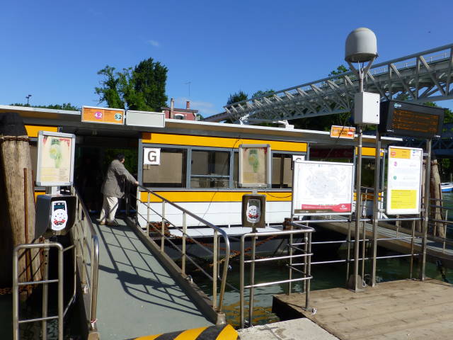 左がヴァポレット停留所。停留所には電工掲示板が設置されていて、どの方面行きのヴァポレットが、あと何分で来るのか一目で分かります。
