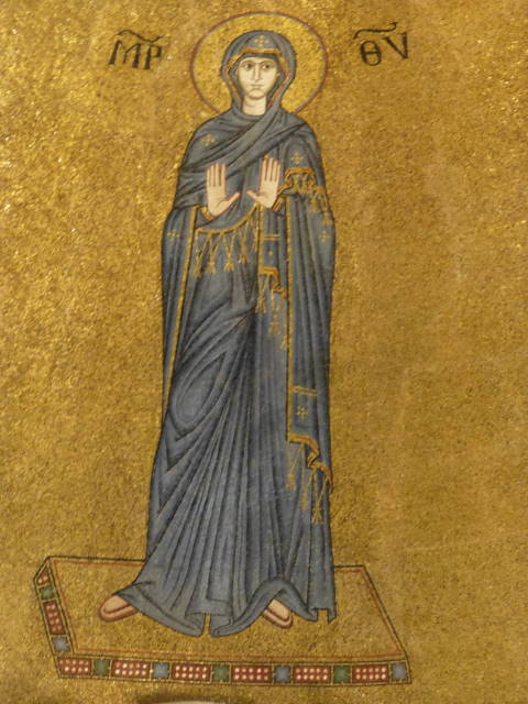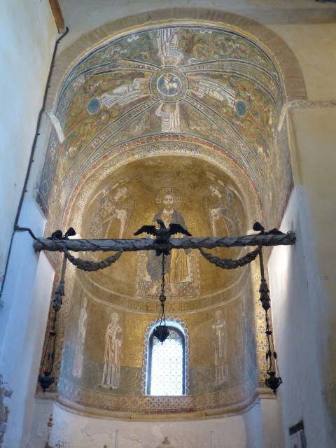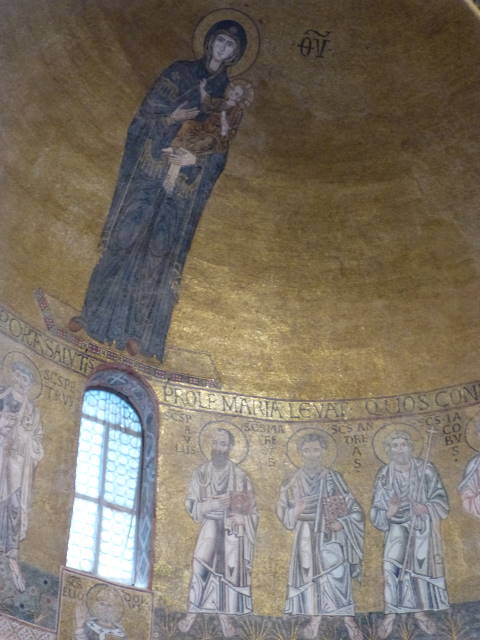 教会内部。最大の見所は、礼拝堂天井部の黄金モザイクのマリア像。