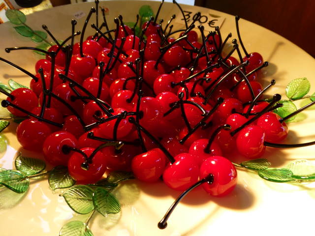 一番凄かったのが、左のサクランボ。本物と見紛うほどの出来栄え、ヘタまでガラス製です!