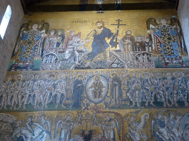 最後の審判のモザイク画。左下が天国、右下に地獄が描かれています。