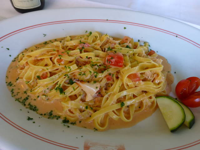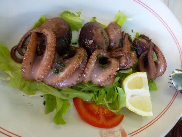 左からゆで蛸の前菜@14EUR、イカと海老と野菜のフリット@20EUR、ズワイガニのパスタ@23EUR。