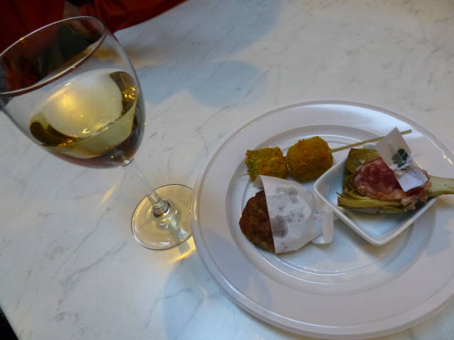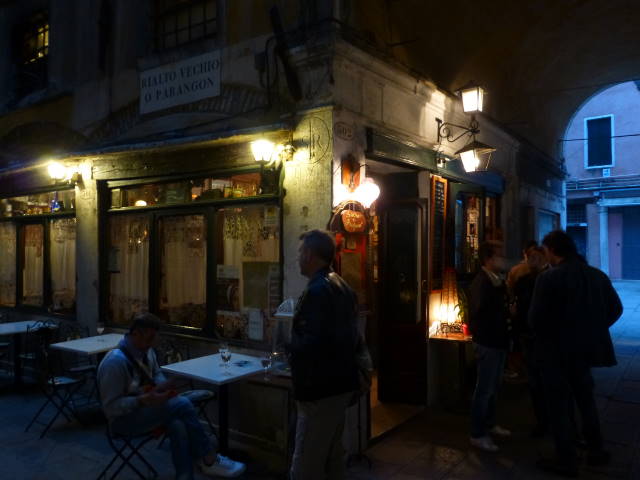 昨日の昼に行ったら閉まっていたバーカロ(Bacaro)が営業していた! ワインと小皿料理の夕食。会計は12EUR。