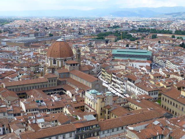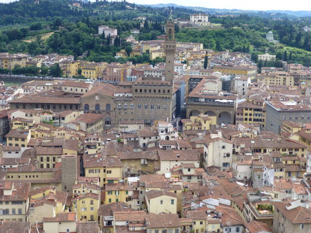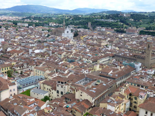 左からジョットの鐘楼、ヴェッキオ宮殿(Palazzo Vecchio)、サンタ・クローチェ教会(Basilica di Santa Croce)、緑色の屋根の建物が中央市場。