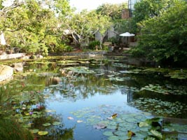 右:ロータスポンド(蓮の池)。期間限定で直径1m以上の蓮の葉に乗れる