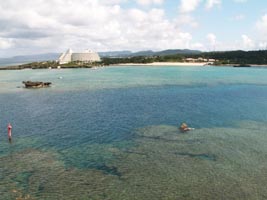 ベランダからの眺め。対岸に見えるホテルが、今沖縄本島で一番人気の