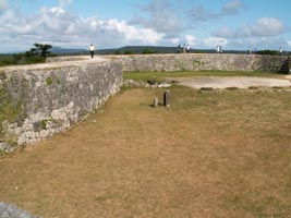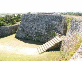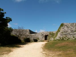 城郭内面積は7385u。沖縄最古のアーチ型石門やサンゴ石灰岩の石積み城壁が