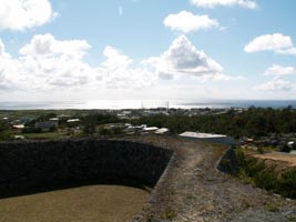 城頂の標高は127m。読谷の町と東シナ海が一望できます。中央に見えるのが