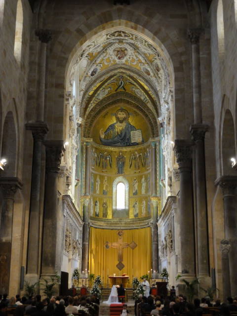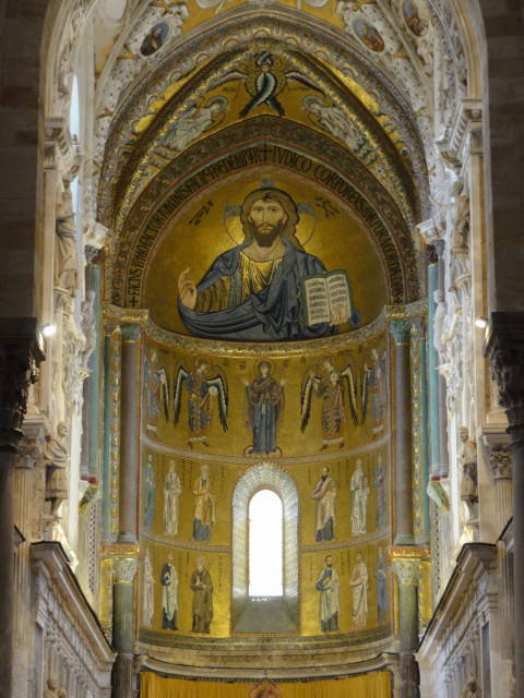 ノルマン時代の外観と、内部中央のビザンチン時代のモザイクが圧巻。