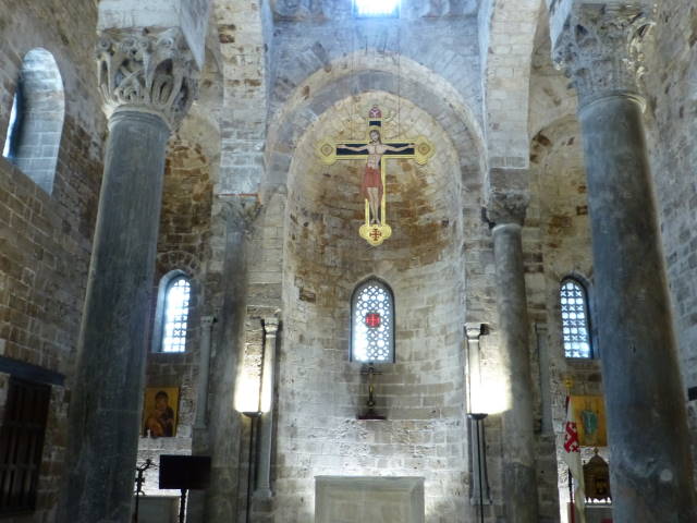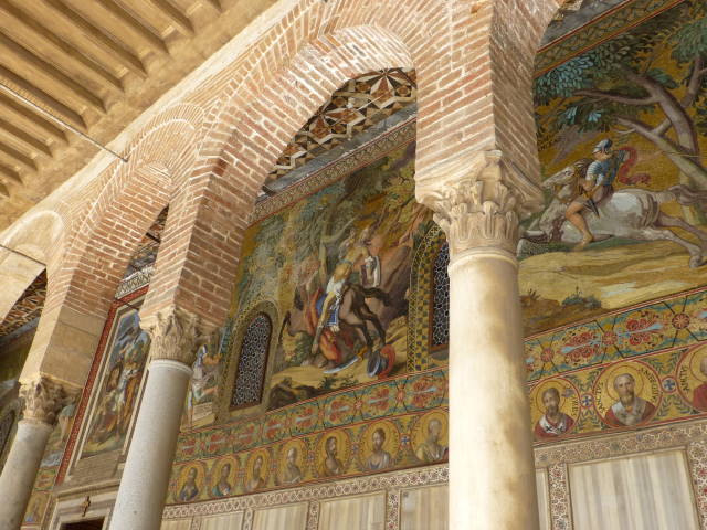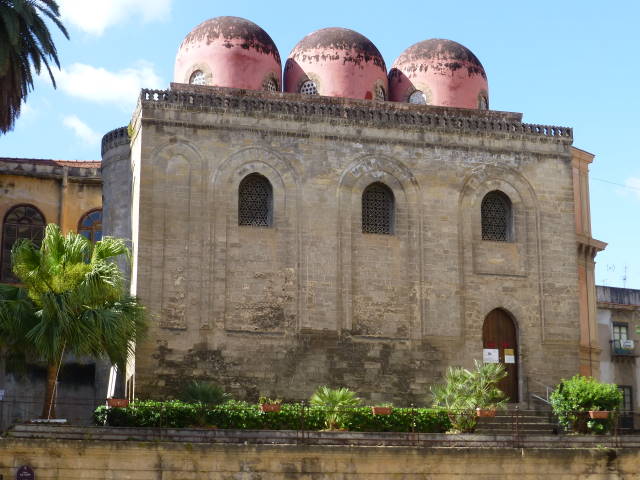 典型的なアラブ・ノルマン様式の教会で、5つの赤い丸屋根が特徴。