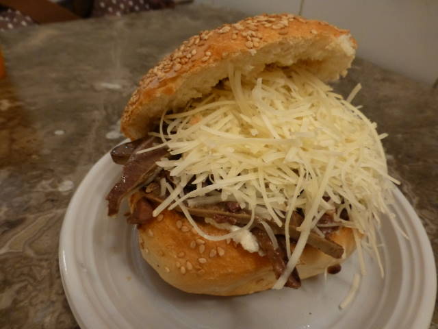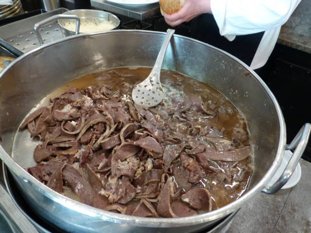 パンを半分に切って、脾臓の煮込みを「これでもかっ!」ってほど入れて、リコッタチーズを挟んで完成。