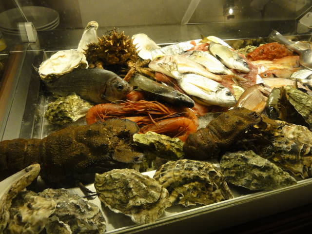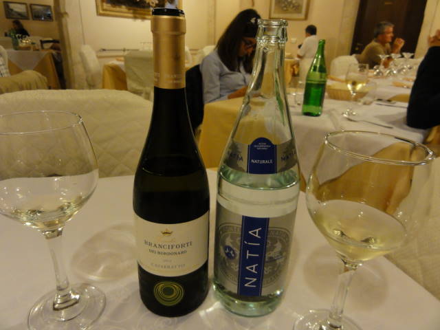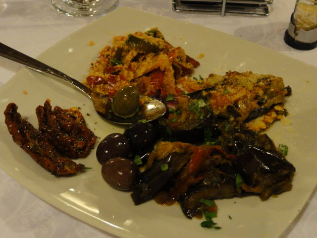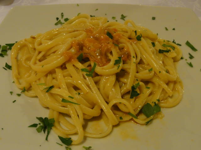 シチリア風前菜10EUR、サラダ6EUR、ウニのパスタ15EUR、シラクーサ風パスタ10EUR、どれも美味! 白ワインのフルボトルが12EUR、ミネラルウォーター1Lが2EUR、テーブルチャージが1人2EUR、計59EURでした。