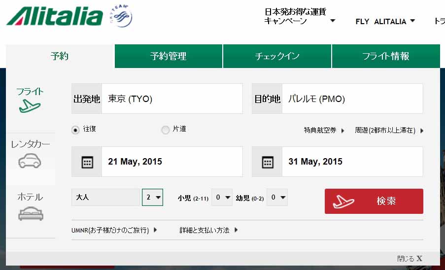 ←アリタリア航空のウェブサイト。往復の希望日を入力するだけで簡単に検索可。ANAと違って、イグジット・ロー等の足が伸ばせる席は別料金。