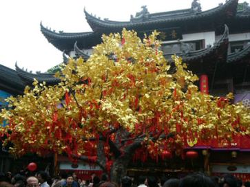 1つ5元で売られている布製の札を投げ、 枝に掛かれば願いが叶うとされている。 |