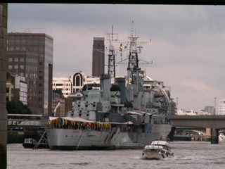 左:戦艦ベルファスト号。現在は横浜港の氷川丸と同じように係留され、