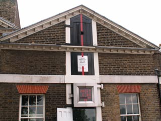 左:建物の壁に引かれた、子午線0度を表す赤いライン。