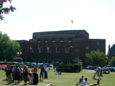 ロイヤル・シェイクスピア劇場(写真)周辺の公園は、多くの人々で賑わっていた。 またすぐ近くを流れるエイヴォン川では、遊覧船に乗ることもできる。