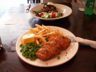 昼食はパブへ。ここに限らず、イギリスはどこへ行っても中華やイタリアン、 ファーストフード店が多く、イギリス料理(なんてもんがあるのかな?)を 食べさせる店はない。少しでもイギリスらしい料理を・・・。ということで、 結局注文したのがフィッシュ&チップスとジャック・ポテト。 コーラとセブン・アップも頼んで11.42GBP。