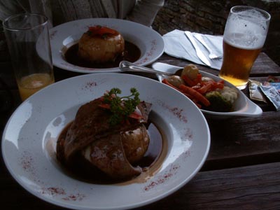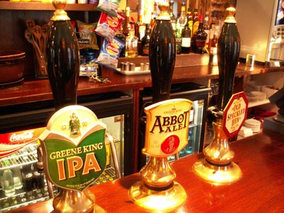 ホテル内のレストランは朝食のみ。というわけで、近くにある オールド・マンズ・ホテルのBARへ。まずはイングリッシュ・ビールで 乾杯(カミさんは下戸なのでジュース)。イングリッシュ・ビールは、 ラガー・ビールと製法が違うため少々ぬるいが、なかなか味わい深い。 軽く2パイントを飲み干す。1パイント2.35GBP。