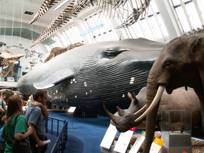 陸海に棲む現生哺乳類の実物大モデルが展示されているホール。象やキリン、