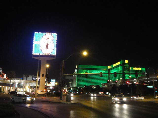 左は有名なフラミンゴ(Flamingo)のネオンサイン。真ん中は 新フォーコーナー(New Four Corner)から見たストリップ。右の写真の 左側が今回泊まったモーテル6(Motel6)、右奥の緑の建物がMGMグランド。
