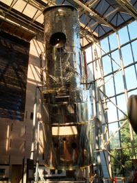右:ハッブル宇宙望遠鏡の実物大模型。