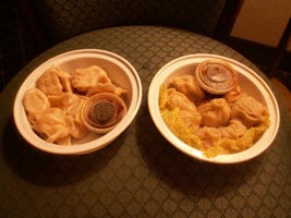 買ってきたのがこれ。シーフード蒸し餃子×10と、豚肉の小龍包×8で$10。