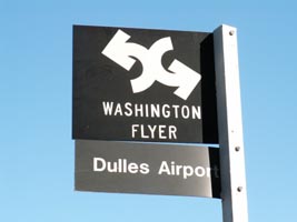 地下鉄で「West Falls Church」駅へ移動。ここからダレス空港行きのバスが 出ている。地下鉄は、既にこの辺りでは地上を走っているので、 バスターミナルは駅に到着すればすぐに分かる。ダレス空港行きバス乗り場は、 この看板が目印。30分に1本しかないので、時間に余裕を持って行った方が良い。 料金は$8(往復なら$14)。ダレス空港に到着後、バスに乗り込んでくる 係員に支払う仕組み。